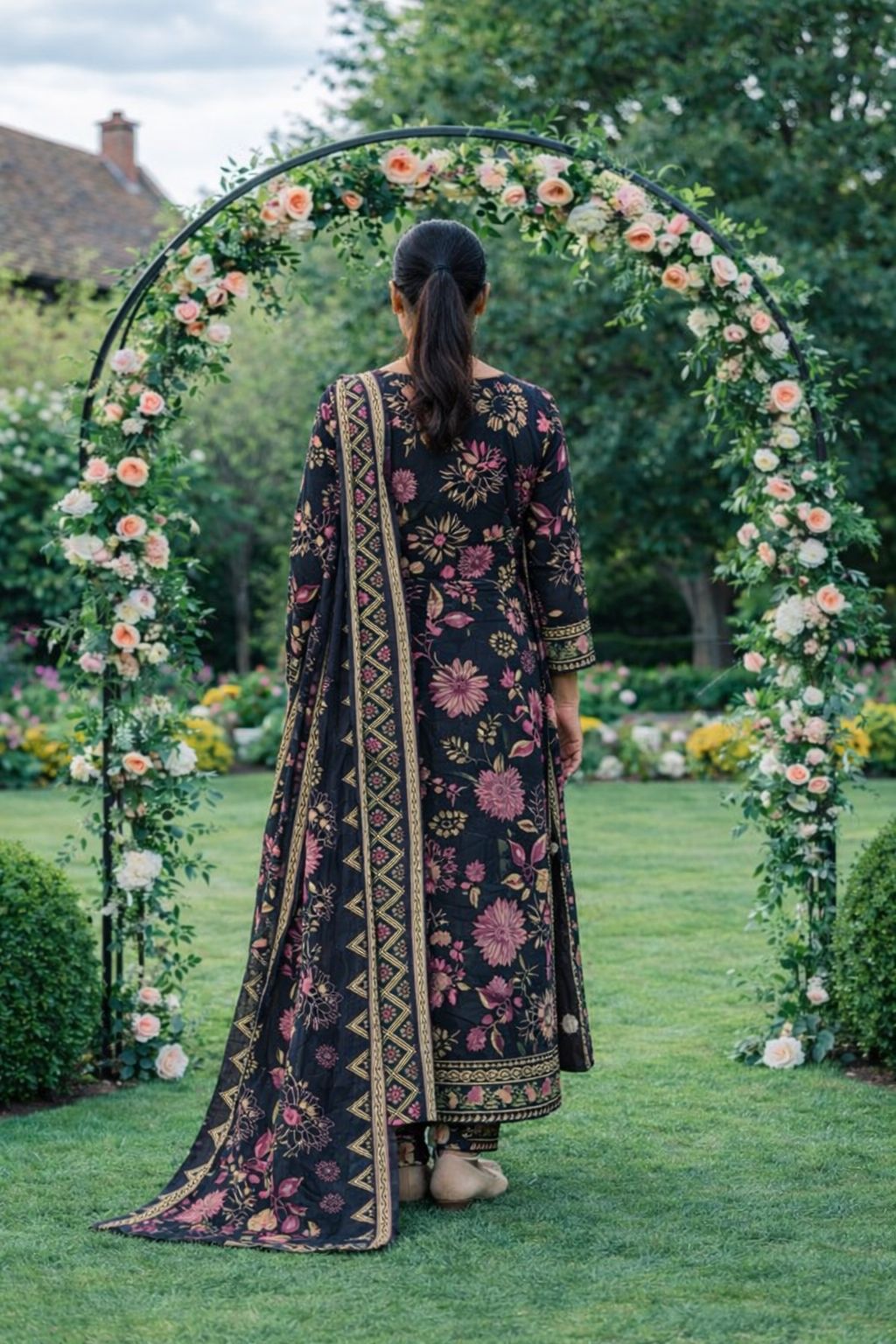 This elegant three-piece salwar suit set features a rich black base adorned with intricate pink floral prints and subtle gold detailing.